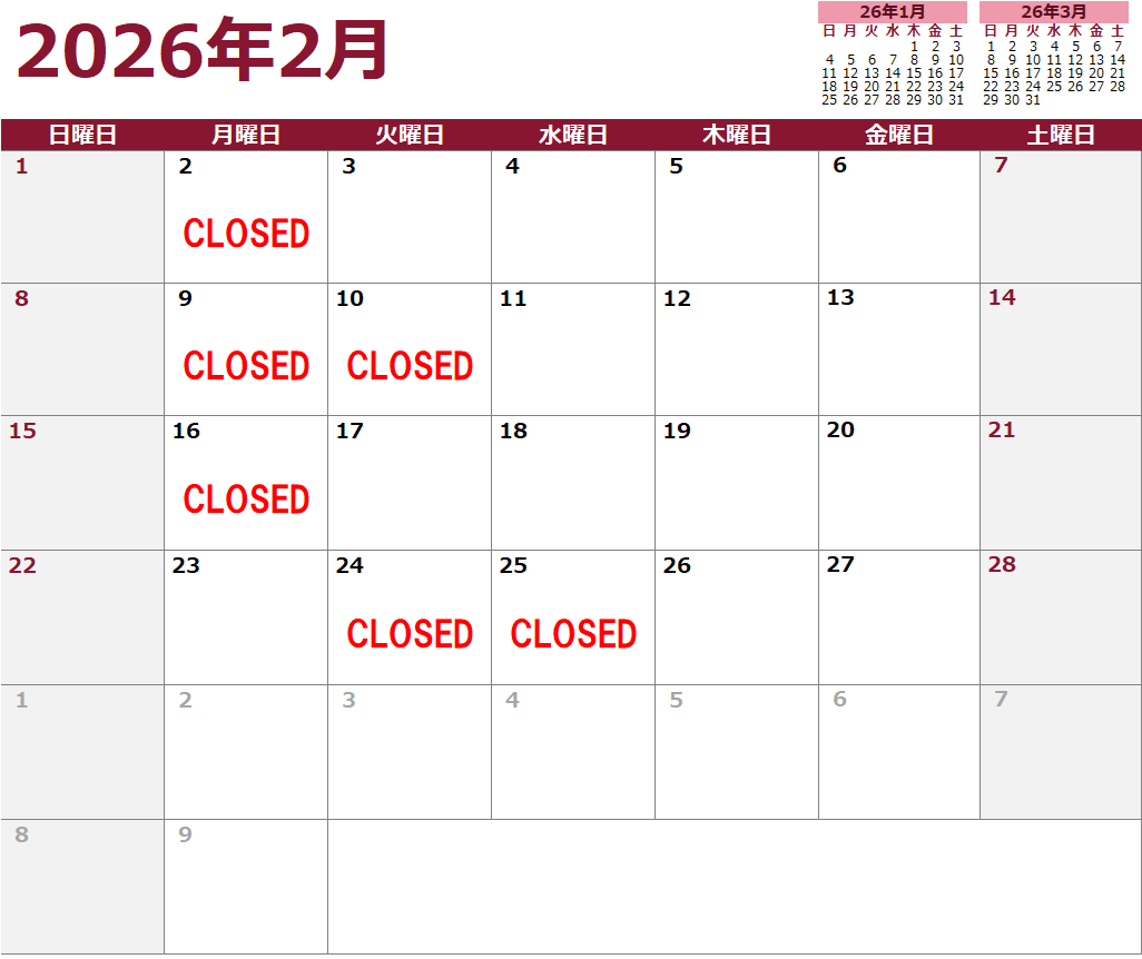 2月のレストラン営業カレンダー/February Restaurant Calendar