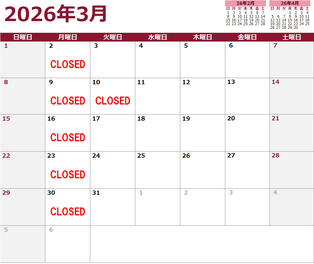 3月のレストラン営業カレンダー/March Restaurant Calendar