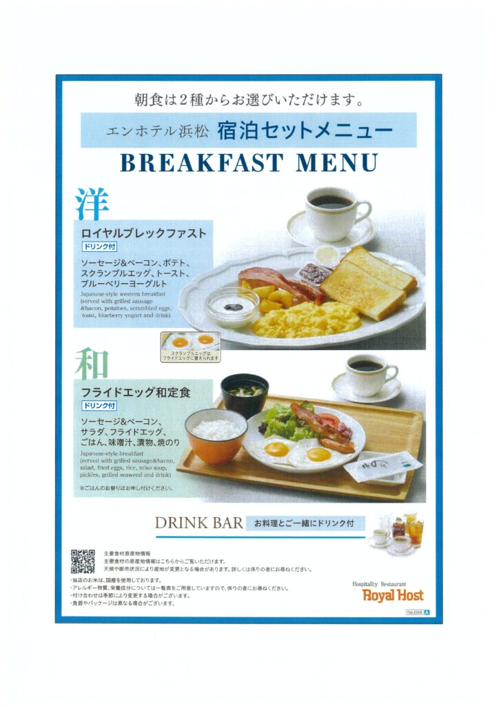 当ホテルより徒歩1分のロイヤルホストでの朝食付プラン発売中!「ロイヤルブレクファスト」と「朝の和定食」からお選びいただけます。ドリンクバー付きでのご案内です。